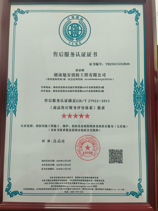 湖南旭安消防工程有限公司凭借卓越的服务体系与客户满意度,顺利通过GB/T27922-2011《商品售后服务评价体系》权威认证,荣获五星级服务最高评级!
